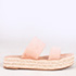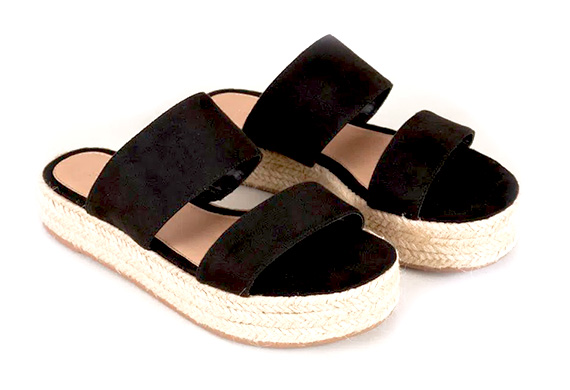 Flatform em camurça, cabedal em duas tiras, salto em corda natural de 3,5 cm