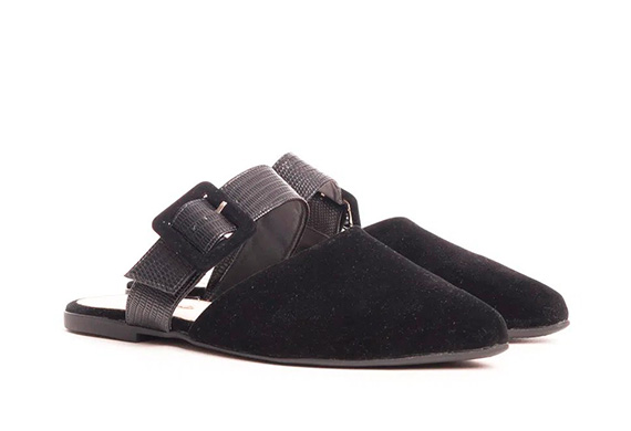 Mule em nobuck, cabedal em tira no peito do pé com fechamento em fivela.