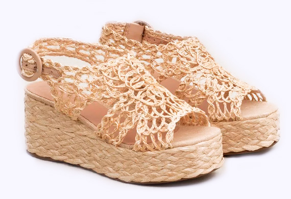 Plataforma em trama natural entrelaçada, cabedal fechado, fechamento em fivela no tornozelo.