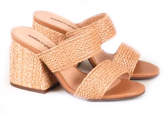 Tamanco em rafia natural, salto bloco assimétrico de 8,5 cm, cabedal em 2 tiras
